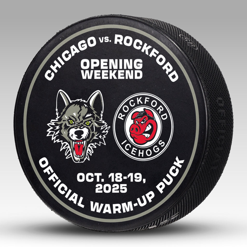 Own a piece of the Wolves' 2025-26 Opening Weekend! These authentic pucks were used during pregame warm-ups by both teams on April 19, 2025, when the Wolves defeated the Rockford IceHogs 6-5. The pucks feature the Wolves and Rockford logos and the game date on the front; each puck will show varying signs of wear and use and are sold as-is.