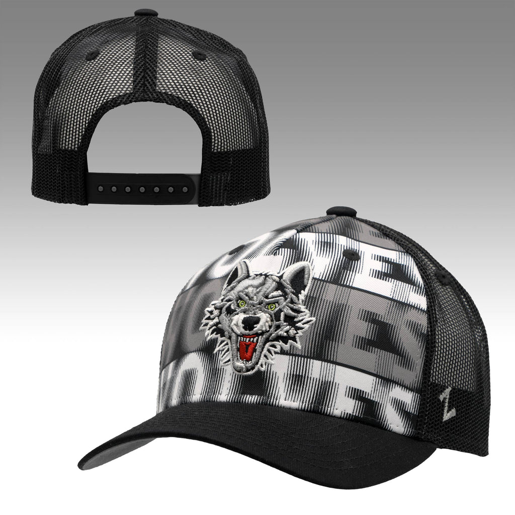 They'll make a statement in the Zephyr Youth Rowdy Hat! This structured, semi-curved trucker hat features an embroidered Wolves logo on top of blurred printed “Wolves” text on the front and an adjustable plastic strap closure.